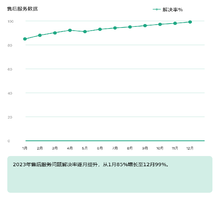 2023年售后服務問題解決率逐月提升,從1月85%增長至12月99%,顯示出持續(xù)改進的成效。